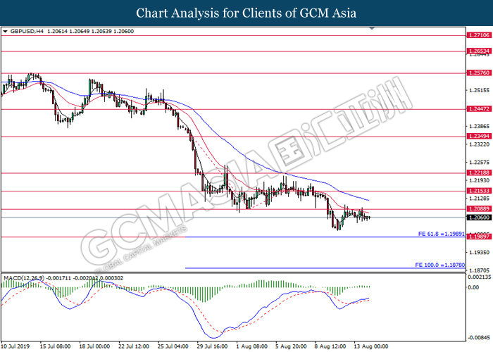 GBPUSD, H4: GBPUSD telah didagang dengan lebih rendah susulan dengan pengunduran dari tahap rintangan 1.2090. MACD yang memaparkan penyusutan pada momentum bullish mencadangkan pasangan ini untuk melanjutkan kerugiannya ke arah tahap sokongan 1.1990.