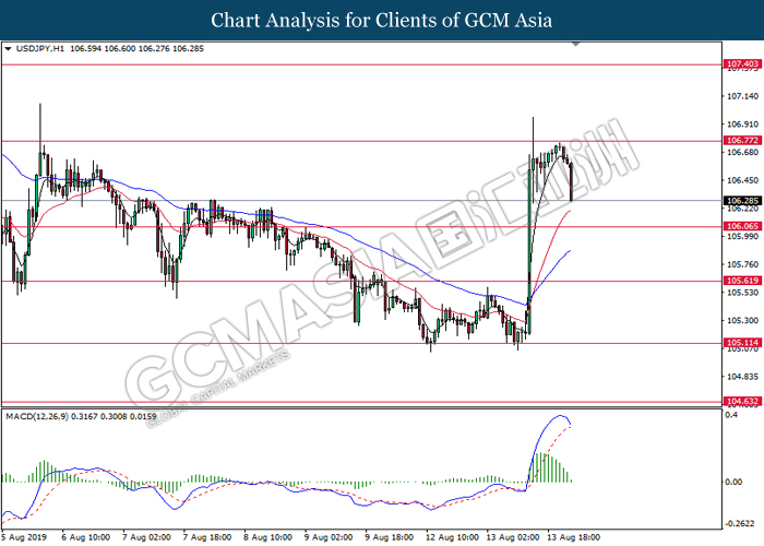USDJPY, H1: USDJPY telah didagang dengan lebih rendah susulan dengan pengunduran dari tahap rintangan 106.75. MACD yang memaparkan penyusutan pada momentum bullish mencadangkan pasangan ini untuk melanjutkan kerugiannya ke arah tahap sokongan 106.65.