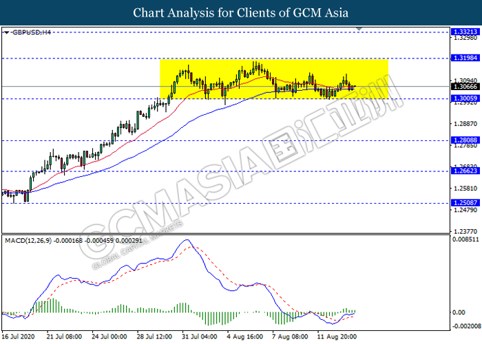 GBPUSD, H4: GBPUSD rkekal didagang dalam saluran sisi sementara ia sedang menguji berhampiran dengan tahap sokongan 1.3005. Namun, MACD yang memaparkan isyarat momentum bullish dengan permulaan formasi silang emas baru-baru ini mencadangkan pasangan ini untuk didagang dengan lebih tinggi ke arah tahap rintangan 1.3200.