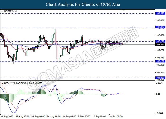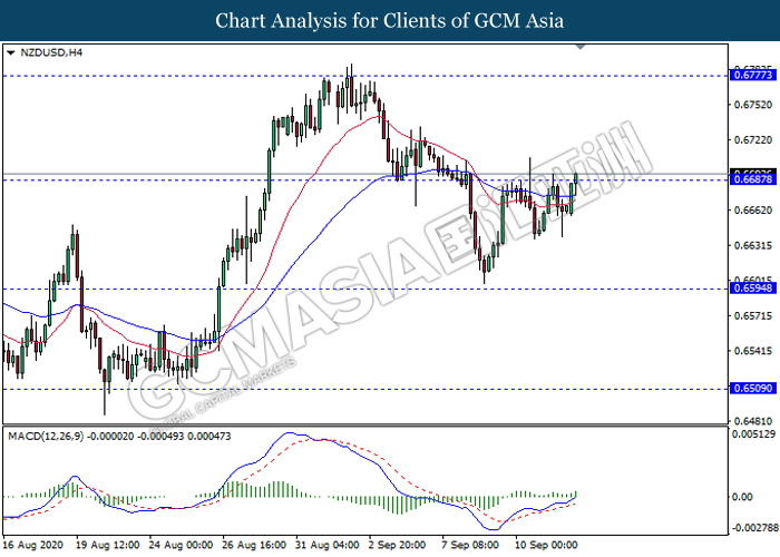 NZDUSD, H4: NZDUSD telah didagang dengan lebih tinggi sementara ia sedang menguji berhampiran dengan tahap rintangan 0.6685. MACD yang memaparkan isyarat bias bullish mencadangkan pasangan ini untuk melanjutkan keuntungannya selepas ia memecah tahap rintangan tersebut.