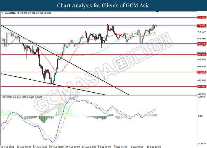 CrudeOIL, H4: Harga minyak mentah telah didagang dengan lebih tinggi sementara kini menguji di tahap rintangan 70.40. MACD yang memaparkan momentum bullish mencadangkan komoditi tersebut untuk melanjutkan keuntungannya selepas ia memecah tahap rintangan tersebut.