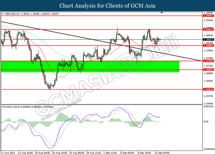 GBPUSD, H4: GBPUSD telah didagang dengan lebih rendah sementara kini menguji di tahap sokongan 1.3805. MACD yang memaparkan momentum bullish yang berkurangan mecadangkan pasangan ini untuk melanjutkan kerugiannya selepas ia memecah tahap sokongan tersebut.