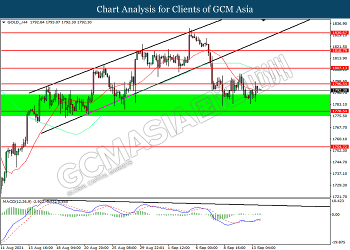 GOLD_, H4: Harga emas telah didagang dengan lebih tinggi sementara kini menguji di tahap rintangan 1796.55. MACD yang memaparkan momentum bullish mencadangkan komoditi ini untuk melanjutkan keuntungannya selepas ia memecah tahap rintangan tersebut.