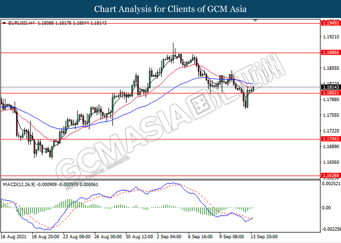 EURUSD, H4: EURUSD telah didagang dengan lebih tinggi susulan dengan lantunan dari tahap sokongan 1.1800. MACD yang memaparkan isyarat momentum bearish yang berkurangan mencadangkan pasangan ini untuk melanjutkan keuntungannya ke arah tahap rintangan 1.1885.