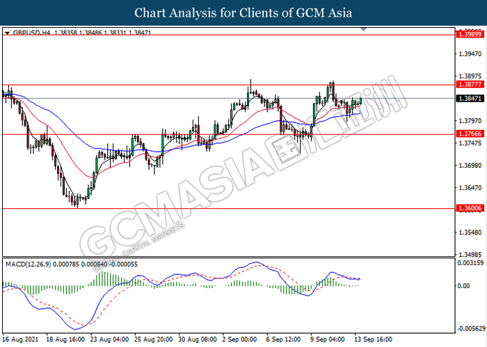 GBPUSD, H4: GBPUSD telah didagang dengan lebih tinggi susulan dengan lantunan dari paras rendahnya. MACD yang memaparkan isyarat bias bullish mencadangkan pasangan ini untuk melanjutkan lantunannya ke arah tahap rintangan 1.3875.