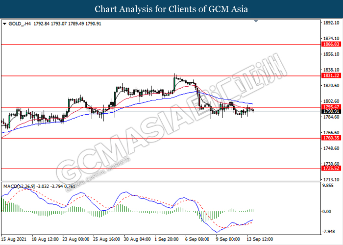 GOLD, H4: Harga emas kekal didagang dengan rata berhampiran dengan tahap rintangan 1795.45. Namun, MACD yang memaparkan isyarat momentum bullish yang berkurangan mencadangkan komoditi ini untuk didagang dengan lebih rendah ke arah tahap sokongan 1760.35.
