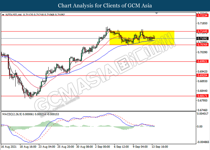 NZDUSD, H4: NZDUSD kekal didagang dengan rata dalam saluran sisi. Namun, MACD yang memaparkan isyarat momentum bearish mencadangkan pasangan ini untuk didagang dengan lebih rendah dalam jangka pendek ke arah tahap sokongan 0.7075.