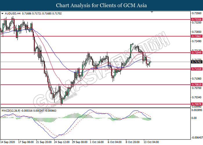 AUDUSD, H4: AUDUSD telah didagang dengan lebih tinggi selepas ia melantun dari tahap sokongan di 0.7140. MACD yang memaparkan isyarat momentum bearish yang berkurangan mencadangkan pasangan ini untuk melanjutkan keuntungannya dan menuju ke arah tahap rintangan di 0.7205.