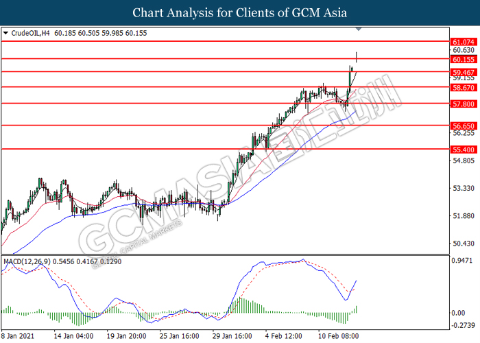 CrudeOIL, H4: Harga minyak mentah telah didagang dengan lebih tinggi sementara ia sedang menguji tahap rintangan di 60.15. MACD yang memaparkan momentum bullish yang berterusan mencadangkan komoditi ini untuk melanjutkan keuntungannya selepas ia memecah tahap rintangan tersebut.