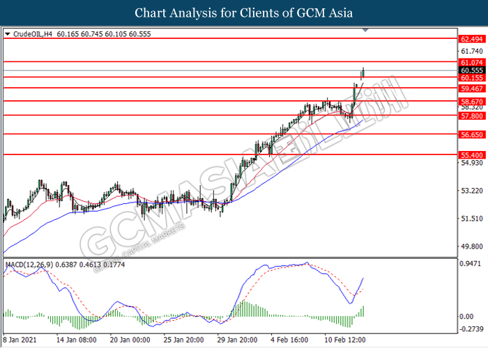 CrudeOIL, H4: Harga minyak mentah telah didagang dengan lebih tinggi sementara ia sedang menguji tahap rintangan di 60.15. MACD yang memaparkan momentum bullish yang berterusan mencadangkan komoditi ini untuk melanjutkan keuntungannya selepas ia memecah tahap rintangan tersebut.