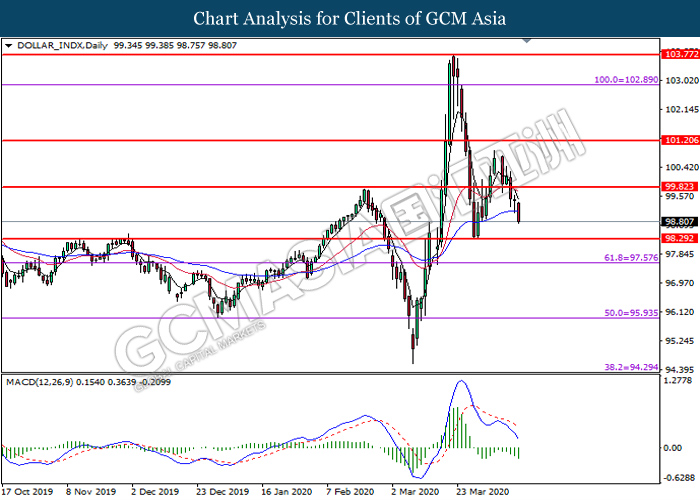 DOLLAR_INDX, H4: Indeks dolar telah didagang dengan lebih rendah selepas ia memecah tahap sokongan terdahulu di 99.80. MACD yang memaparkan isyarat momentum bearish yang berterusan mencadangkan indeks ini untuk melanjutkan kerugiannya dan menuju ke arah tahap sokongan di 98.30.