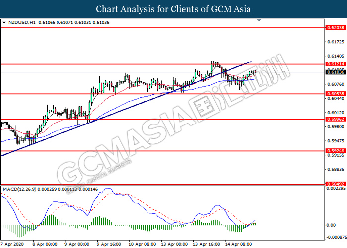 NZDUSD, H1: NZDUSD telah didagang dengan lebih tinggi selepas ia melantun dari tahap yang lebih rendah. MACD yang memaparkan isyarat momentum bullish mencadangkan pasangan ini untuk melanjutkan keuntungannya dan menuju ke arah tahap rintangan di 0.6120.