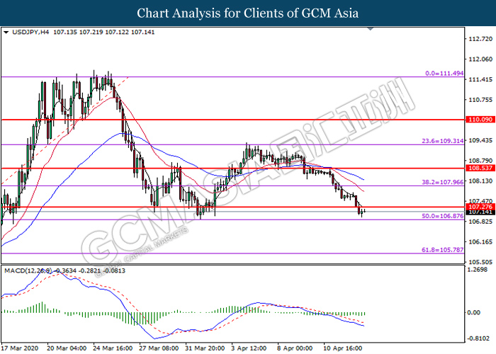 Di antara semua mata wang utama dalam pasaran FX, mata wang Yen naik berbanding dengan mata wang lain di tengah-tengah penurunan selera risiko pasaran semasa wabak koronavirus. Menurut statistik terkini, jumlah kes yang disahkan pada masa ini meningkat ke 2 juta sementara jumlah kematian juga meningkat ke 120,000 kes. Setakat ini, AS kini berada di kedudukan sebagai pusat penyebaran Koronavirus, dengan kes yang disahkan lebih daripada 587,000 manakala kadar kematian hampir 23,650 kes. Walaupun virus berkembang dengan serius di Amerika Syarikat, Trump memberikan kejutan pada hari semalam dengan mendedahkan bahawa pentadbirannya masih memuktamadkan rancangan untuk membuka semula ekonomi AS, yang sebelum ini dipaksa untuk menutup negaranya untuk memperlahankan penyebaran virus. Sebelum ini, Presiden Amerika Syarikat, Donald Trump menegaskan bahawa dia mempunyai ‘kuasa mutlak’ untuk memutuskan pengangkatan sekatan tersebut sambil memberi isyarat bahawa terdapat kemungkinan besar mereka untuk meringankan sekatan di AS pada hari pertama bulan Mei. Selain itu, AS menegaskan bahawa prerogatif untuk mengangkat sekatan terpulang kepada mereka, dan mereka telah membentuk satu persekutuan untuk bekerjasama untuk membuka semula negara masing-masing pada masa yang akan datang ini. Sehingga kini, pasangan USD/JPY menurun sebanyak 0.01% ke 107.15.