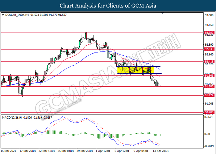 DOLLAR_INDX, H4: Indeks dolar telah didagang dengan lebih rendah sementara ia sedang menguji tahap sokongan di 91.60. MACD yang memaparkan isyarat momentum bearish yang berterusan mencadangkan indeks ini untuk melanjutkan kerugiannya selepas ia memecah tahap sokongan tersebut.