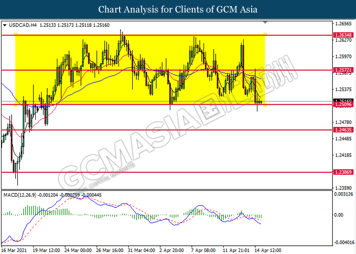 USDCAD, H4: USDCAD telah didagang dengan lebih rendah sementara ia sedang menguji tahap sokongan di 1.2510. MACD yang menunjukkan isyarat momentum bearish yang berterusan mencadangkan pasangan ini untuk didagang dengan lebih rendah selepas ia memecah tahap sokongan tersebut.