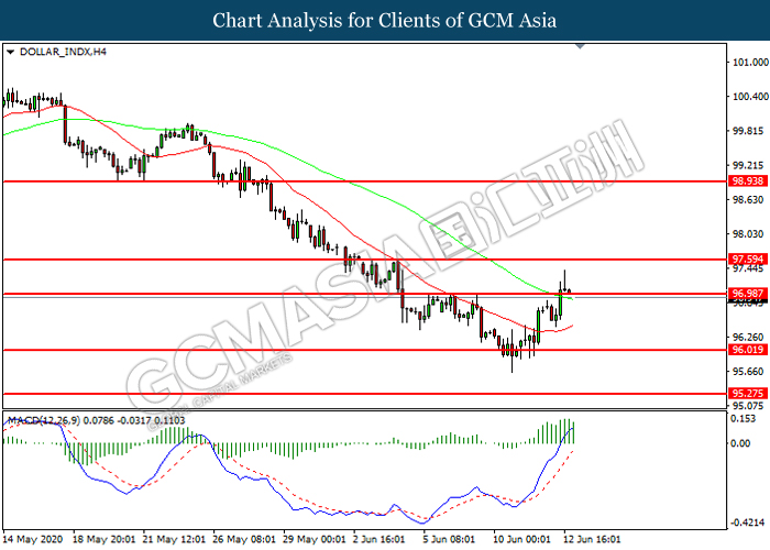 DOLLAR_INDX, H4: Indeks dolar telah didagang dengan lebih tinggi sementara kini menguji di tahap rintangan 97.00. Namun, MACD yang memaparkan momentum bullish yang berkurangan mencadangkan indeks tersebut untuk mengalami pembetulan teknikal bagi jangka pendek.