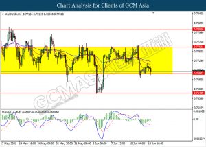 AUDUSD, H4: AUDUSD kekal didagang dalam saluran sisi sementara ia sedang menguji tahap sokongan 0.7695. Namun, MACD yang memaparkan isyarat momentum bearish yang berterusan mencadangkan pasangan ini untuk melanjutkan kerugiannya selepas ia memecah tahap sokongan tersebut.