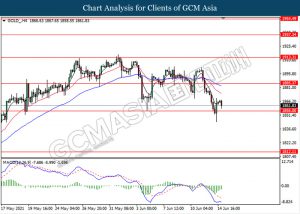 GOLD_, H4: Harga emas telah didagang dengan lebih rendah sementara ia sedang menguji tahap sokongan 1856.00. MACD yang memaparkan isyarat momentum bearish yang berterusan mencadangkan komoditi ini untuk melanjutkan kerugiannya selepas ia memecah tahap sokongan tersebut.