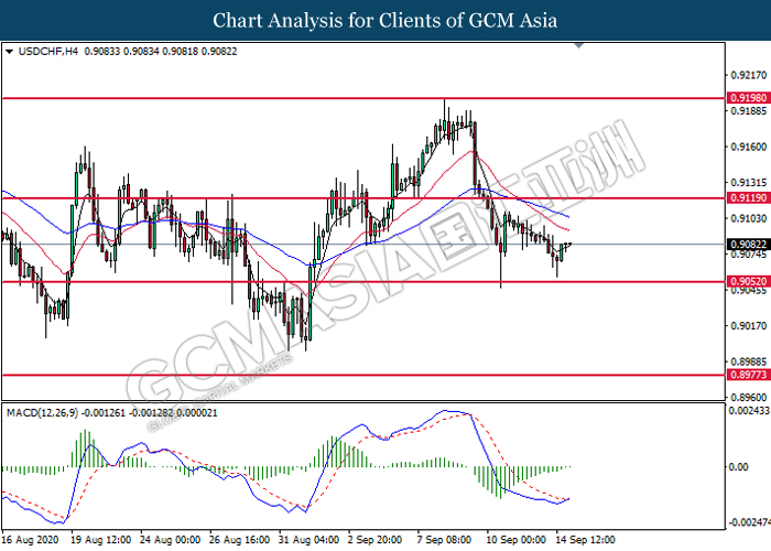 USDCHF, H4: USDCHF telah didagang dengan lebih tinggi selepas ia melantun dari tahap sokongan di 0.9050. MACD yang memaparkan isyarat momentum bearish yang berkurangan mencadangkan pasangan ini untuk didagang dengan lebih tinggi dan menuju ke arah tahap rintangan di 0.9120.