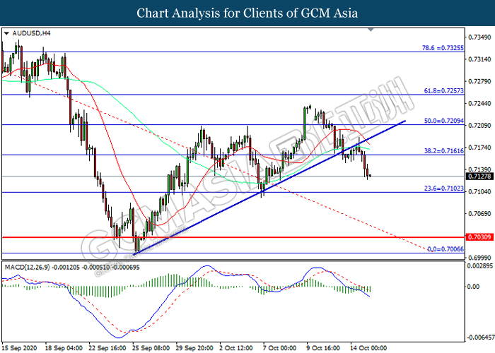 AUDUSD, H4: AUDUSD telah didagang dengan lebih rendah selepas ia berundur dari tahap rintangan 0.7160. MACD yang memaparkan momentum bearish mencadangkan pasangan ini untuk melanjutkan kerugiannya ke arah tahap sokongan 0.7100.