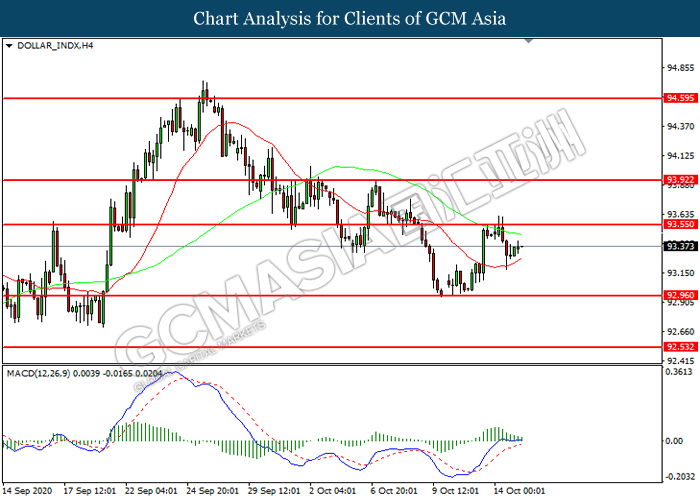 DOLLAR_INDX, H4: Indeks dolar telah didagang dengan lebih rendah selepas ia berundur dari tahap rintangan 93.55. Namun, MACD yang memaparkan momentum bullish yang berkurangan mencadangkan indeks tersebut untuk melanjutkan kerugiannya ke arah tahap sokongan 92.95.