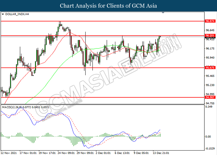 Indeks Dolar yang didagang terhadap sebakul enam pasangan mata wang utama telah melonjak selepas Amerika Syarikat membebaskan data inflasi yang tinggi semalam, mencetuskan jangkaan hawkish untuk Rizab Persekutuan semasa mesyuarat penting FOMC. Menurut kepada A.S. Bureau of Labor Statistik, Producer Price Indeks A.S. bagi bulan lepas telah meningkat dengan ketara dari bacaan terdahulu sebanyak 0.6% ke bacaan sebanyak 0.8%, melebihi ramalan pasaran sebanyak 0.5%. Bersama-sama dengan pasaran buruh AS yang semakin ketat, tekanan harga yang meningkat berkemungkinan akan mendorong Rizab Persekutuan untuk mempercepatkan pengurangan program pembelian bon besar-besaran awal dan meningkatkan kemungkinan kenaikan kadar lebih awal daripada yang dijangkakan sebelum ini. Bantuan kewangan yang agresif sebelum ini daripada kerajaan di seluruh dunia telah meningkatkan permintaan yang ketara untuk barangan, menyebabkan rantaian bekalan menjadi terlalu tegang. Pada masa kini, para pelabur akan memberi tumpuan kepada keputusan Rizab Persekutuan semasa mesyuarat FOMC untuk menerima isyarat dagangan selanjutnya. Semasa penulisan, Indeks Dolar telah meningkat sebanyak 0.25% ke 96.55.