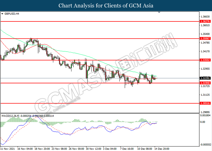 GBPUSD, H4: GBPUSD telah didagang dengan lebih rendah sementara kini menguji di tahap sokongan 1.3195. MACD yang memaparkan momentum bullish yang berkurangan mencadangkan pasangan ini untuk melanjutkan kerugiannya selepas ia memecah tahap sokongan tersebut.