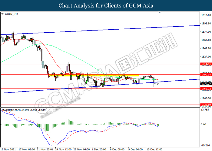 GOLD_, H4: Harga emas telah didagang dengan lebih rendah selepas ia berundur dari tahap rintangan 1790.20. MACD yang memaparkan momentum bearish mencadangkan komoditi ini untuk melanjutkan kerugiannya ke arah tahap sokongan 1762.20.