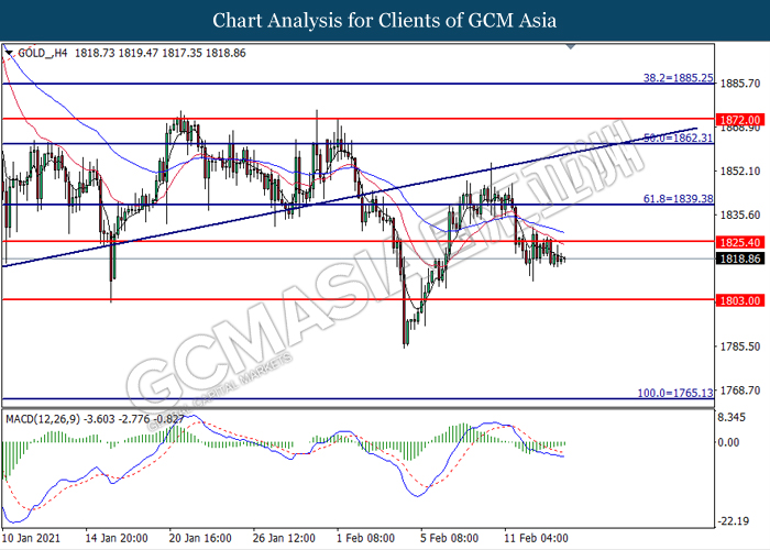 GOLD_, H4: Harga emas telah didagang dengan lebih rendah seleaps ia berundur dari tahap rintangan di 1825.40. Namun, MACD yang memaparkan momentum bearish yang berkurangan mencadangkan komoditi ini untuk mengalami pembetulan teknikal dan menuju ke tahap yang lebih tinggi.