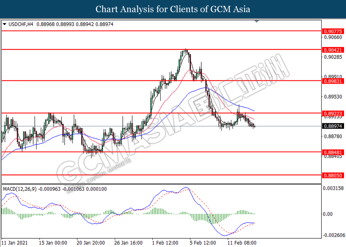 USDCHF, H4: USDCHF telah didagang dengan lebih rendah selepas ia berundur dari tahap rintangan di 0.8920. MACD yang memaparkan momentum bullish yang berkurangan mencadangkan pasangan ini untuk melanjutkan kerugiannya dan menuju ke arah tahap sokongan di 0.8850.