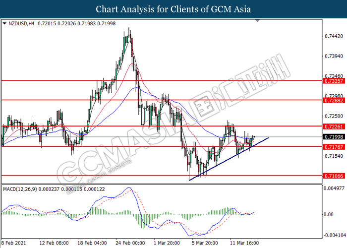 NZDUSD, H4: NZDUSD telah didagang dengan lebih tinggi selepas ia melantun dari tahap sokongan di 0.7175. MACD yang menunjukkan isyarat momentum bullish yang berterusan mencadangkan pasangan ini untuk melanjutkan keuntungannya dan menuju ke arah tahap rintangan di 0.7225.
