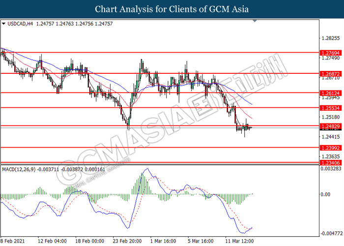 USDCAD, H4: USDCAD telah didagang dengan lebih rata di bawah tahap rintangan di 1.2485. MACD yang menunjukkan isyarat momentum bullish yang berterusan mencadangkan pasangan ini untuk didagang dengan lebih tinggi selepas ia memecah tahap rintangan tersebut.