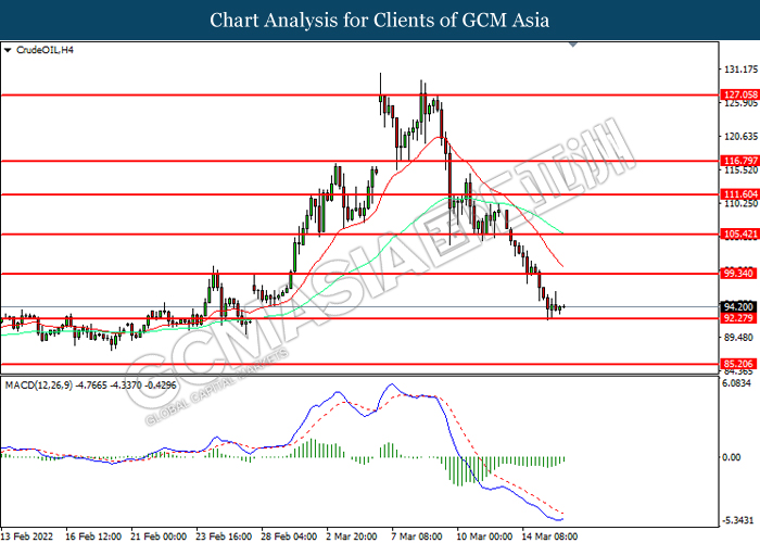 CrudeOIL, H4: Harga minyak mentah telah didagang dengan lebih rendah sementara kini menguji di tahap sokongan. Namun, MACD yang memaparkan momentum bearish yang berkurangan mencadangkan komoditi ini untuk mengalami pembetulan teknikal.