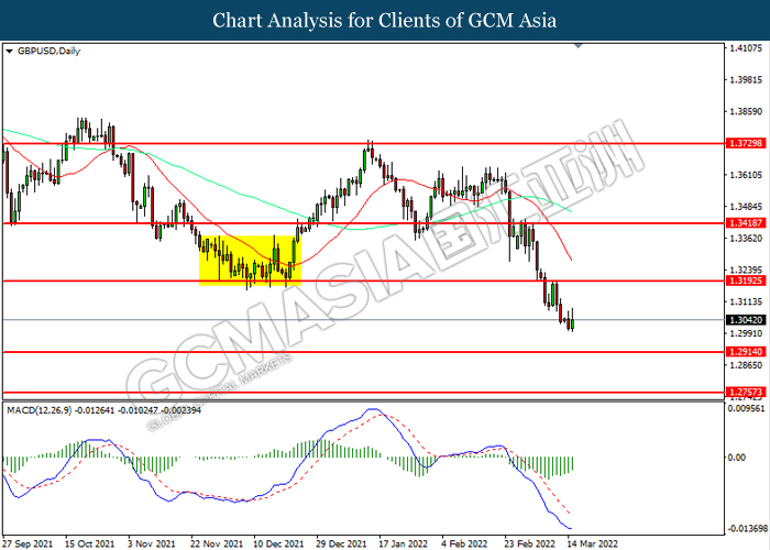 GBPUSD, Daily: GBPUSD telah didagang dengan lebih rendah selepas ia memecah tahap sokongan terdahulu. Namun, MACD yang memaparkan momentum bearish yang berkurangan mencadangkan pasangan ini untuk mengalami pembetulan teknikal.