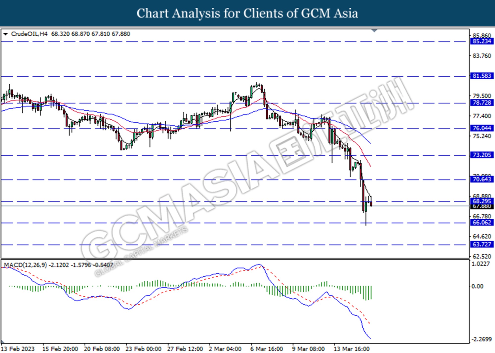 CrudeOIL, H4: Harga minyak mentah telah didagang dengan lebih rendah selepas ia memecah tahap sokongan sebelumnya di 68.30. Namun, MACD yang menunjukkan isyarat momentum bearish yang berterusan mencadangkan komoditi ini untuk mengalami pembetulan teknikal dalam jangka masa yang pendek.