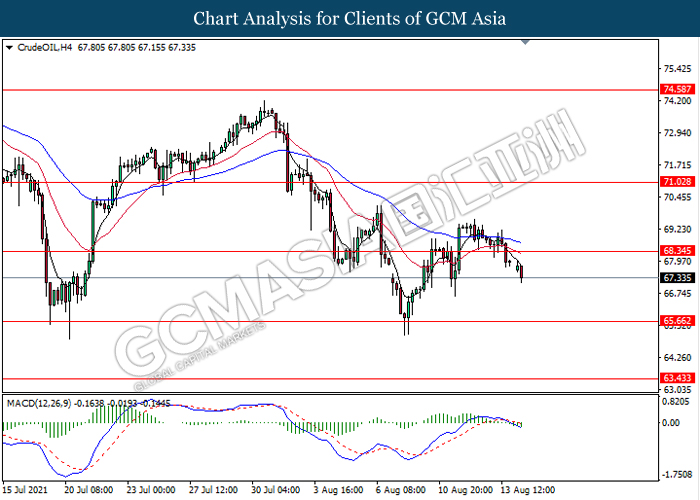 CrudeOIL, H4: Harga minyak mentah telah didagang dengan lebih rendah susulan dengan pemecahan pada tahap sokongan sebelumnya 68.35. MACD yang memaparkan isyarat bias bearish dengan formasi silang kematian mencadangkan komoditi ini untuk melanjutkan kerugiannya ke arah tahap sokongan 65.65.