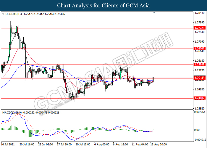 USDCAD, H4: USDCAD telah didagang dengan lebih tinggi sementara ia sedang menguji tahap rintangan 1.2535. MACD yang memaparkan isyarat momentum bullish dengan formasi silang emas mencadangkan pasangan ini untuk melanjutkan keuntungannya selepas ia memecah tahap rintangan tersebut.
