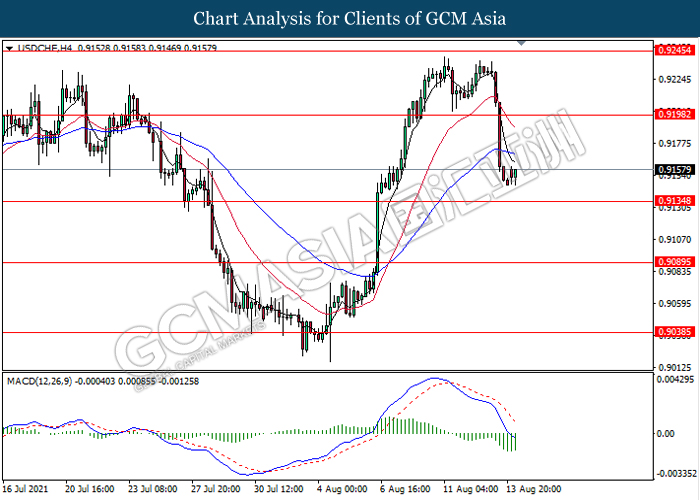 USDCHF, H4: USDCHF telah didagang dengan lebih rendah sementara ia sedang menguji berhampiran dengan tahap sokongan 0.9135. MACD yang memaparkan isyarat momentum bearish mencadangkan pasangan ini untuk melanjutkan kerugiannya selepas ia memecah tahap sokongan tersebut.