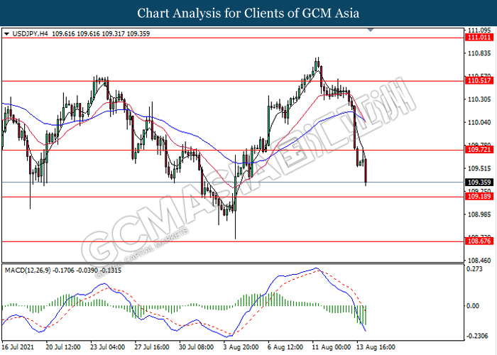 USDJPY, H4: USDJPY telah didagang dengan lebih rendah susulan dengan pemecahan pada tahap sokongan sebelumnya 109.70. MACD yang memaparkan isyarat momentum bearish mencadangkan pasangan ini untuk melanjutkan kerugiannya ke arah tahap sokongan 109.20.