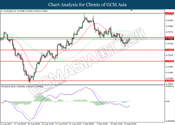 AUDUSD, H4: AUDUSD telah didagang dengan lebih tinggi sementara kini menguji di tahap rintangan 0.7345. MACD yang memaparkan momentum bullish mencadangkan pasangan ini untuk melanjutkan keuntungannya selepas ia memecah tahap rintangan tersebut.