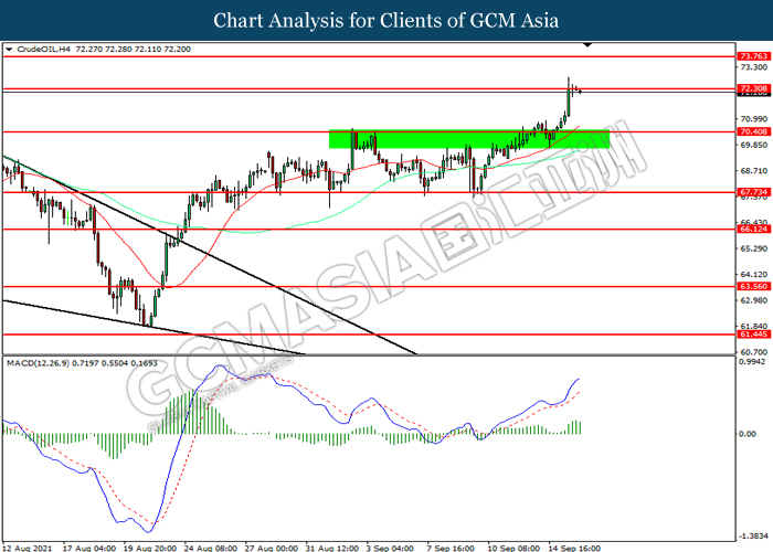 CrudeOIL, H4: Harga minyak mentah telah didagang dengan lebih tinggi sementara kini menguji di tahap rintangan 72.30. MACD yang memaparkan momentum bullish mencadangkan komoditi tersebut untuk melanjutkan keuntungannya selepas ia memecah tahap rintangan tersebut.
