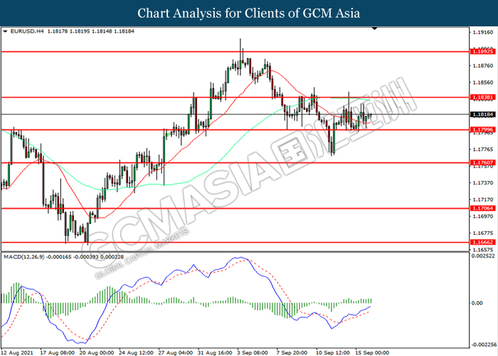 EURUSD, H4: EURUSD telah didagang dengan lebih rendah sementara kini menguji di tahap sokongan 1.1800. Namun, MACD yang memaparkan momentum bullish yang berkurangan mencadangkan pasangan ini untuk mengalami pembetulan teknikal bagi jangka pendek.