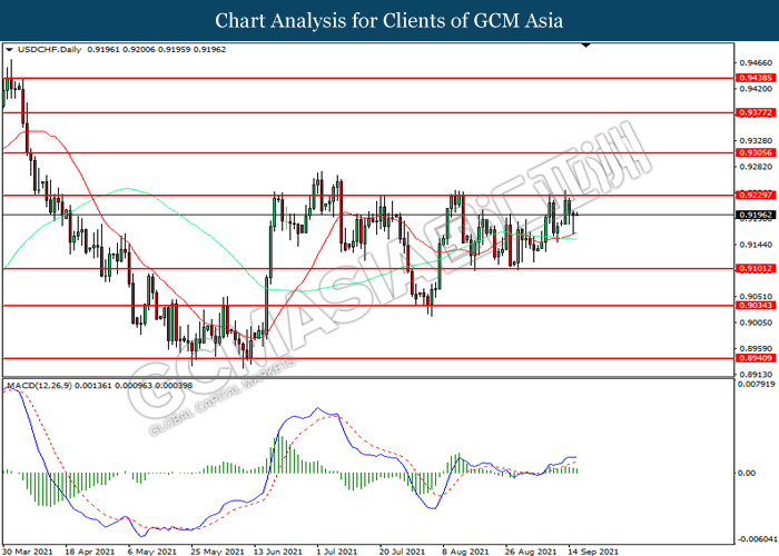 USDCHF, Daily: USDCHF telah didagang dengan lebih tinggi sementara kini menguji di tahap rintangan 0.9230. MACD yang memaparkan momentum bullish mencadangkan pasangan ini untuk melanjutkan keuntungannya selepas ia memecah tahap rintangan tersebut.