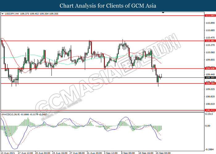 USDJPY, H4:USDJPY telah didagang dengan lebih rendah sementara kini menguji di tahap sokongan 109.60. Namun, MACD yang memaparkan momentum bearish yang berkurangan mencadangkan pasangan ini untuk mengalami pembetulan teknikal bagi jangka pendek.