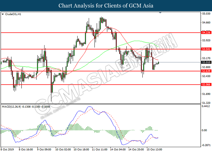 CrudeOIL, H1: Harga minyak mentah telah didagang dengan lebih tinggi selepas ia melantun dari tahap sokongan 52.65. Namun, MACD yang memaparkan momentum bullish yang berkurangan mencadangkan komoditi ini untuk mengalami pembetulan teknikal bagi jangka pendek.