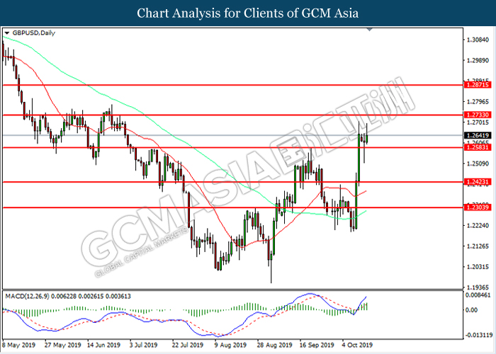 GBP/USD mencatat keuntungannya semalam susulan dengan harapan positif untuk mencapai perjanjian Brexit dalam minggu ini. Para pelabur memberi jangkaan positif untuk Boris Johnson akan mencapai perjanjian Brexit selepas ia membuat konsesi utama untuk permintaan EU yang berikutan dengan sempadan Ireland, menurut Reuters. Tambahan pula, menurut daripada sumber di Kesatuan Eropah dan United Kingdom, jika Downing Street memberikan kelulusan terhadap perjanjian Brexit, draf untuk perjanjian tersebut boleh dikemukakan pada hari Rabu. Sentimen positif untuk isu Brexit juga disokong oleh Jacob Rees-Mogg, Pemimpin House of Common of UK, selepas ia menegaskan bahawa jika Boris Johnson boleh mencapai perjanjian dengan EU, Parlimen akan meluluskan perjanjian tersebut dengan cepat pada hari Sabtu. Selain itu, Paun Sterling menerima sokongan bullish selepas data yang positif untuk U.K Claimant Count dibebaskan. U.K Claimant Count Change memberi bacaan sebanyak 21.1k, lebih rendah daripada jangkaan pasaran, yang selanjutnya mendorong Paun Sterling untuk mencatat keuntungannya. Namun, sesetengah data yang suram dibebaskan semalam telah membatasi keuntungan untuk pasangan tersebut. Menurut kepada Office for National Statistics, U.K Average Earning Indeks + Bonus memberi bacaan sebanyak 3.8%, lebih rendah daripada jangkaan pasaran 4.0% dan Kadar pengangguran UK telah meningkat daripada bacaan sebanyak 3.8% ke 3.9% pada bulan Ogos, yang selanjutnya merangsang penjualan untuk pasangan tersebut. Semasa penulisan, GBP/USD menyusut sebanyak 0.20% ke 1.2758 manakala EUR/USD mencatat keuntungannya sebanyak 0.02% ke 1.1032 susulan dengan jangkaan positif untuk menamatkan isu-isu Brexit pada 31st Oktober.