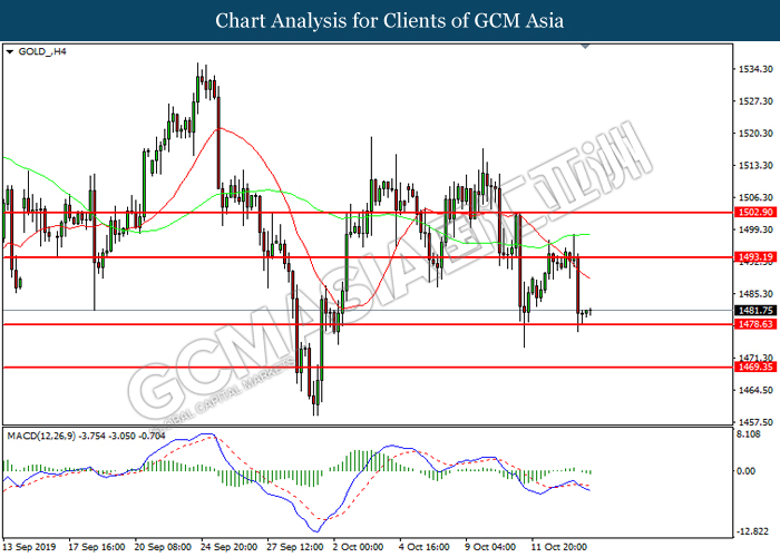 GOLD_, H4: Harga emas telah didagang dengan lebih tinggi selepas ia melantun dari tahap sokongan 1478.65. Namun, MACD yang memaparkan momentum bearish mencadangkan pasangan ini untuk mengalami pembetulan teknikal bagi jangka pendek.