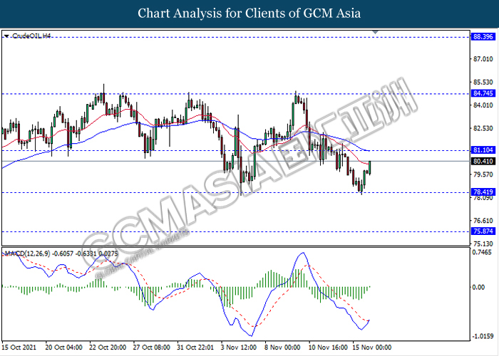 CrudeOIL, H4: Harga minyak mentah telah didagang dengan lebih tinggi sementara ia sedang menguji berhampiran dengan tahap rintangan 81.10. MACD yang memaparkan isyarat momentum bearish yang berkurangan dengan formasi silang emas mencadangkan komoditi ini untuk melanjutkan keuntungannya selepas ia memecah tahap rintangan tersebut.