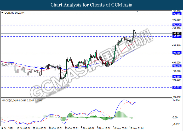 DOLLAR_INDX, H4: Indeks dolar telah didagang dengaan lebih rendah sementara ia sedang menguji berhampiran dengan tahap sokongan 95.20. MACD yang memaparkan isyarat momentum bullish mencadangkan pengundurannya selepas ia memecah tahap sokongan tersebut.