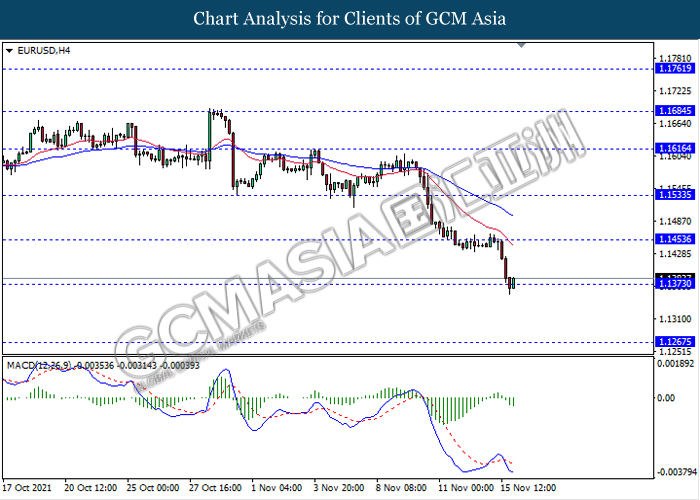 EURUSD, H4: EURUSD telah didagang dengan lebih rendah sementara ia sedang menguji tahap sokongan 1.1375. MACD yang memaparkan isyarat bias bearish mencadangkan pasangan ini untuk melanjutkan kerugiannya selepas ia memecah tahap sokongan tersebut.